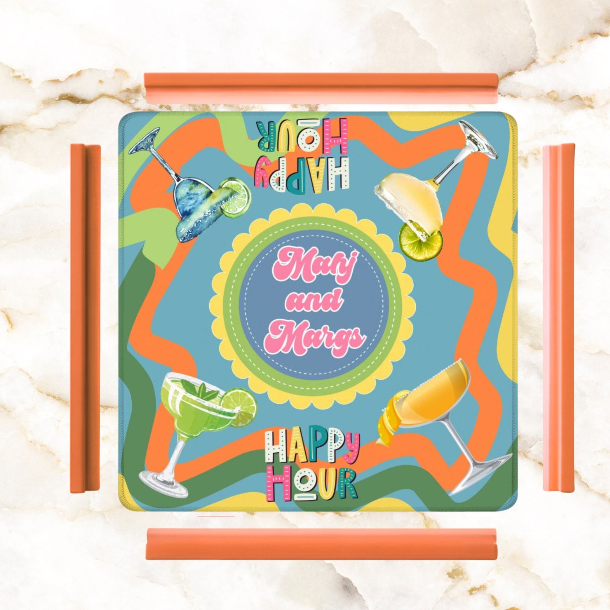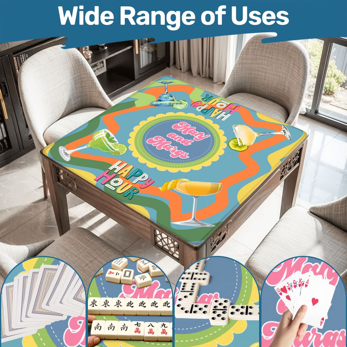 Bring the joy of mahjong night to life with this vibrant, playful mat that's as fun as the game itself. Featuring the cheeky "Mahj and Margs" design, it's the perfect companion for game nights filled with laughter, friendly competition, and good company. Whether you're a seasoned tile-slinger or just getting started, this mat keeps your game organized while adding a splash of personality to your table. Roll it out, gather your crew, and let the good times roll!