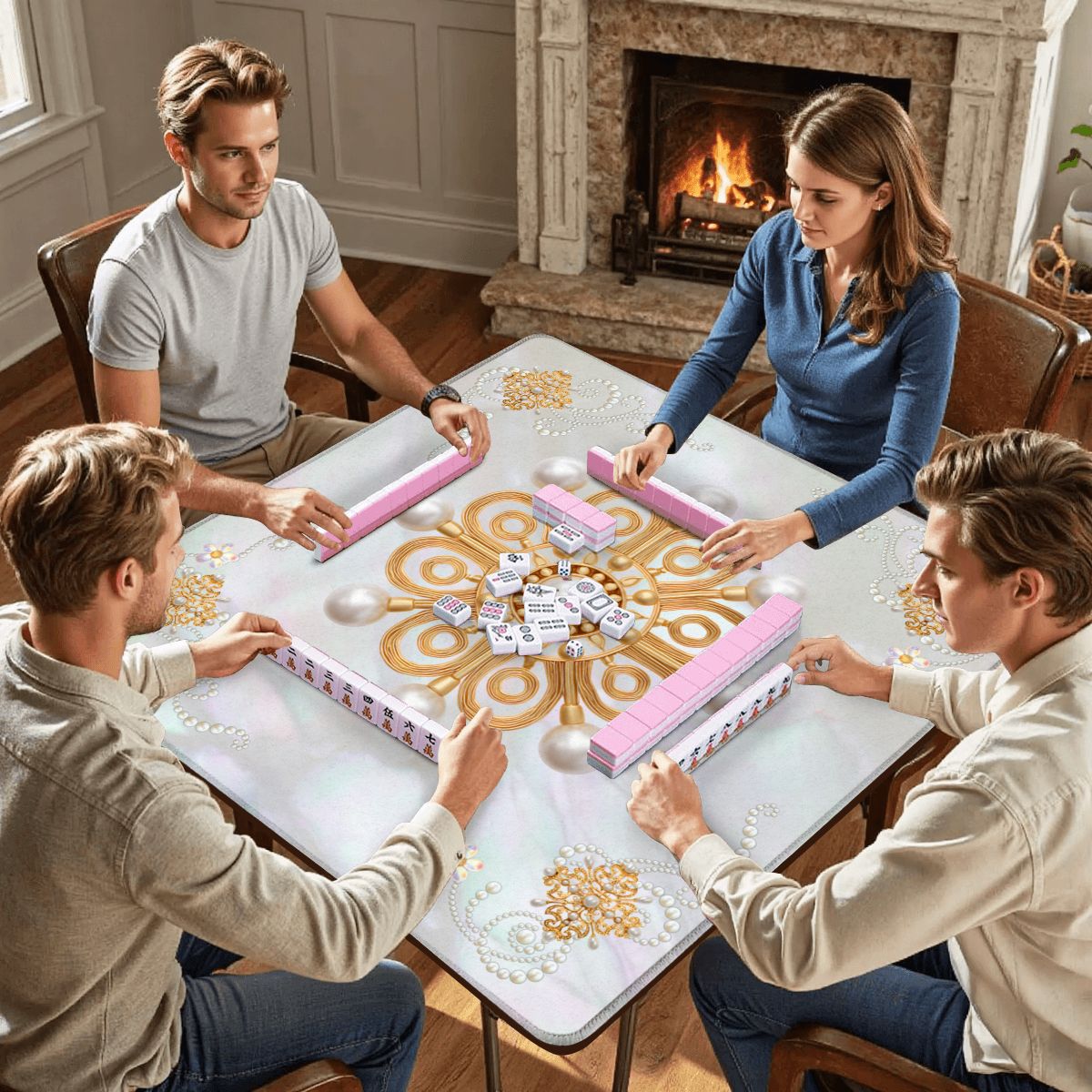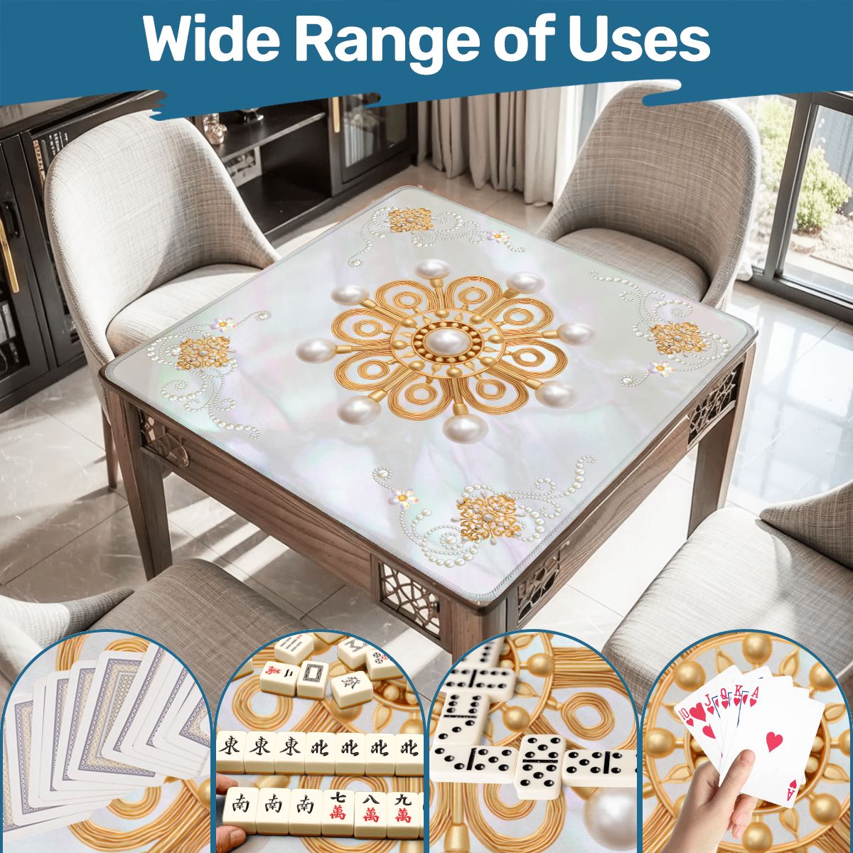 Elevate your mahjong nights with this dazzling mat that's part game essential, part glamorous statement piece. Featuring shimmering mother-of-pearl accents and golden brooch-inspired embellishments, it transforms your table into a sparkling oasis of fun. Perfect for players who refuse to compromise on style, this mat brings serious bling to your favorite pastime. Roll the dice, shuffle those tiles, and let your game space shine as bright as your winning streak.